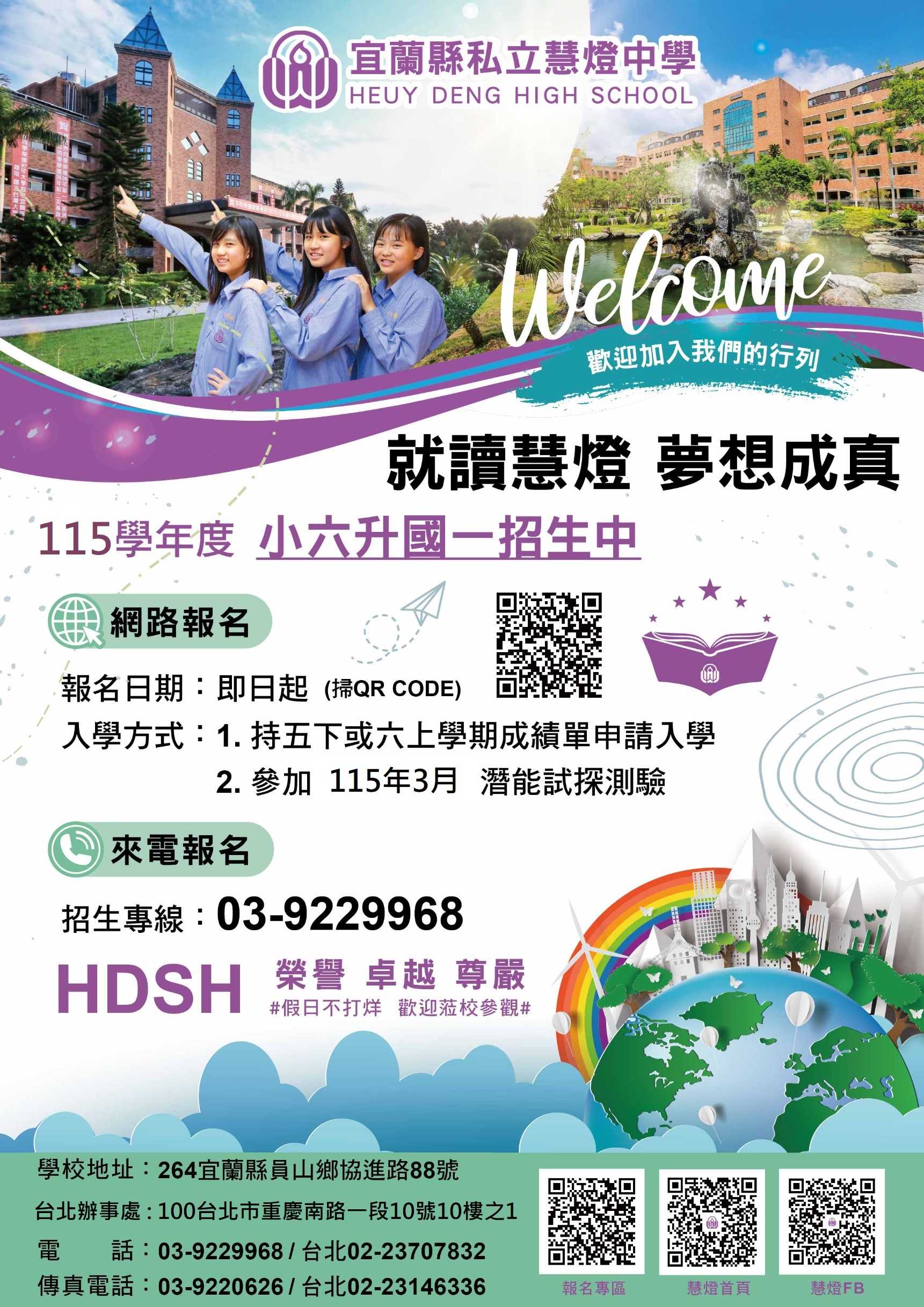 | 一、 | 宜蘭縣私立慧燈高級中學位於宜蘭縣,風光明媚,校園巍峨,是一所重視品德、雙語和人文教育的優質住宿學校。宜蘭縣私立慧燈高級中學已經主管教育行政單位核准,學區包本校括宜蘭縣、臺北市、新北市、基隆市、桃園市、及花蓮縣等,區內學生均可申請入學。 |