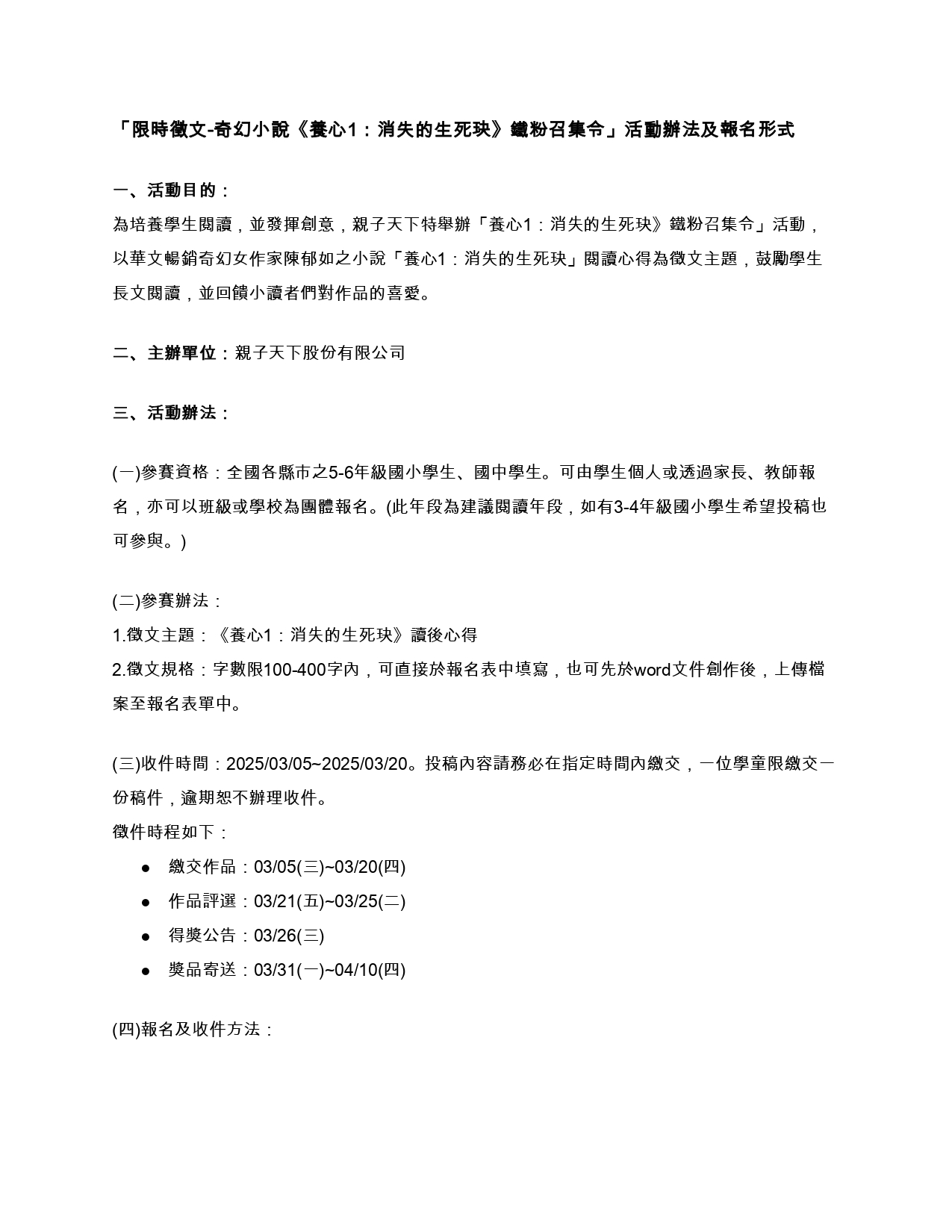 一、為培養學生閱讀興趣,且回饋小讀者對《養心》系列的喜 愛,本公司舉辦限時徵文活動「奇幻小說《養心 1:消失的 生死玦》鐵粉召集令」,參加對象以國小高年級學生至國中 生為主,收件日期至 114 年 03 月 20 日止。惠請於貴單 位網站公告活動訊息,鼓勵師生參與。