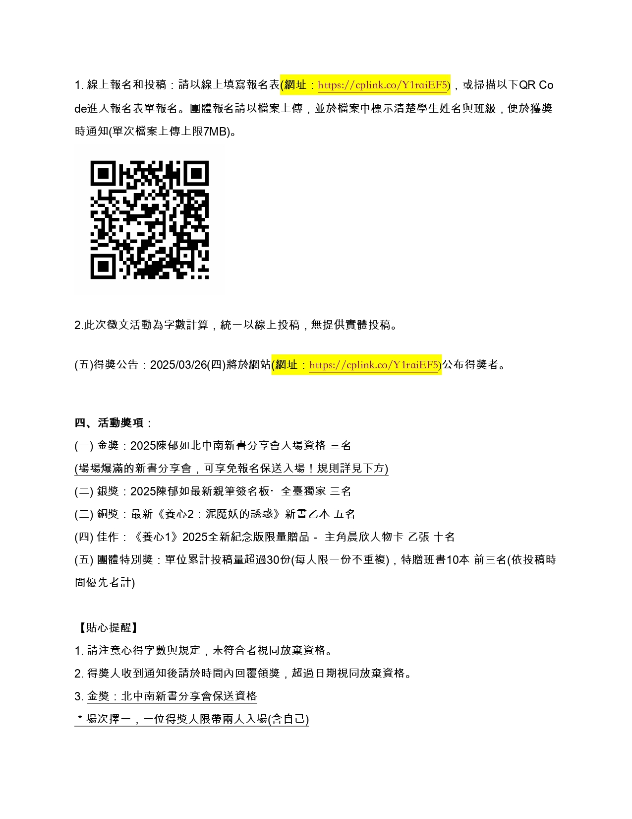 二、檢附報名表單乙份,相關徵文活動辦法置於活動網站 (https://cplink.co/Y1raiEF5),請逕行開啟參閱。