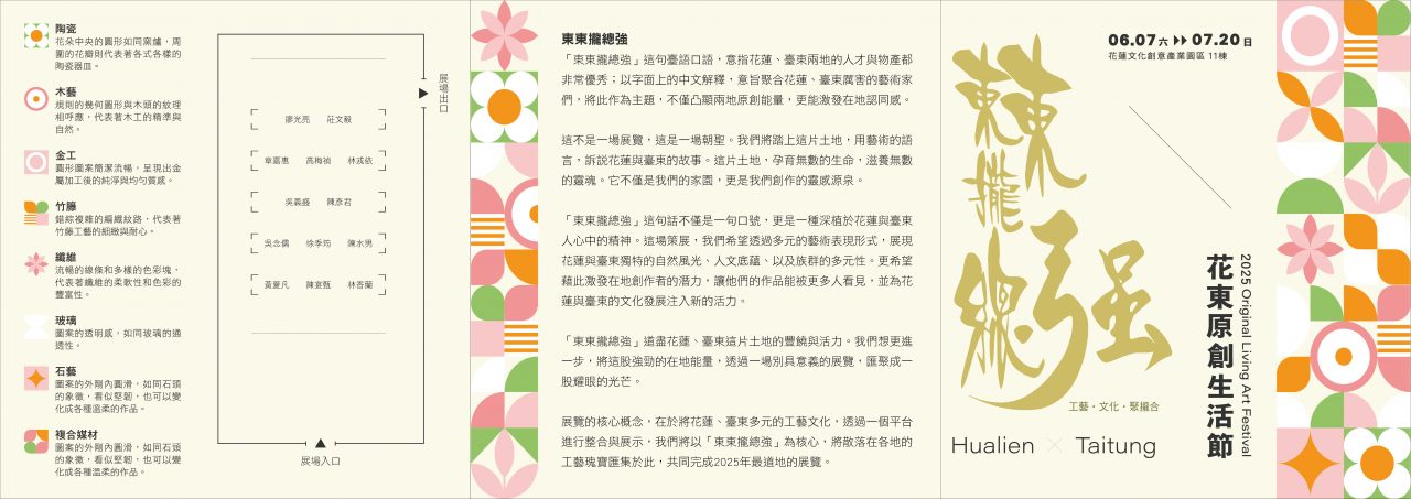 | 一、 | 國立臺東生活美學館將於 6 月 7 日至 7 月 20 日假花蓮市文化創意產業園區第 11 棟,舉辦「2025 花東原創生活節-東東攏總強」特展,展區規劃 13 位花東工藝師們的原創工藝品展區、工藝師導覽、原創生活市集、音樂彈唱會及手作體驗活動。 |