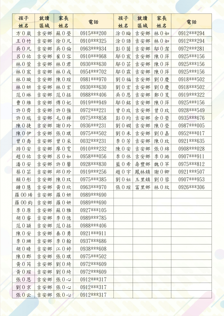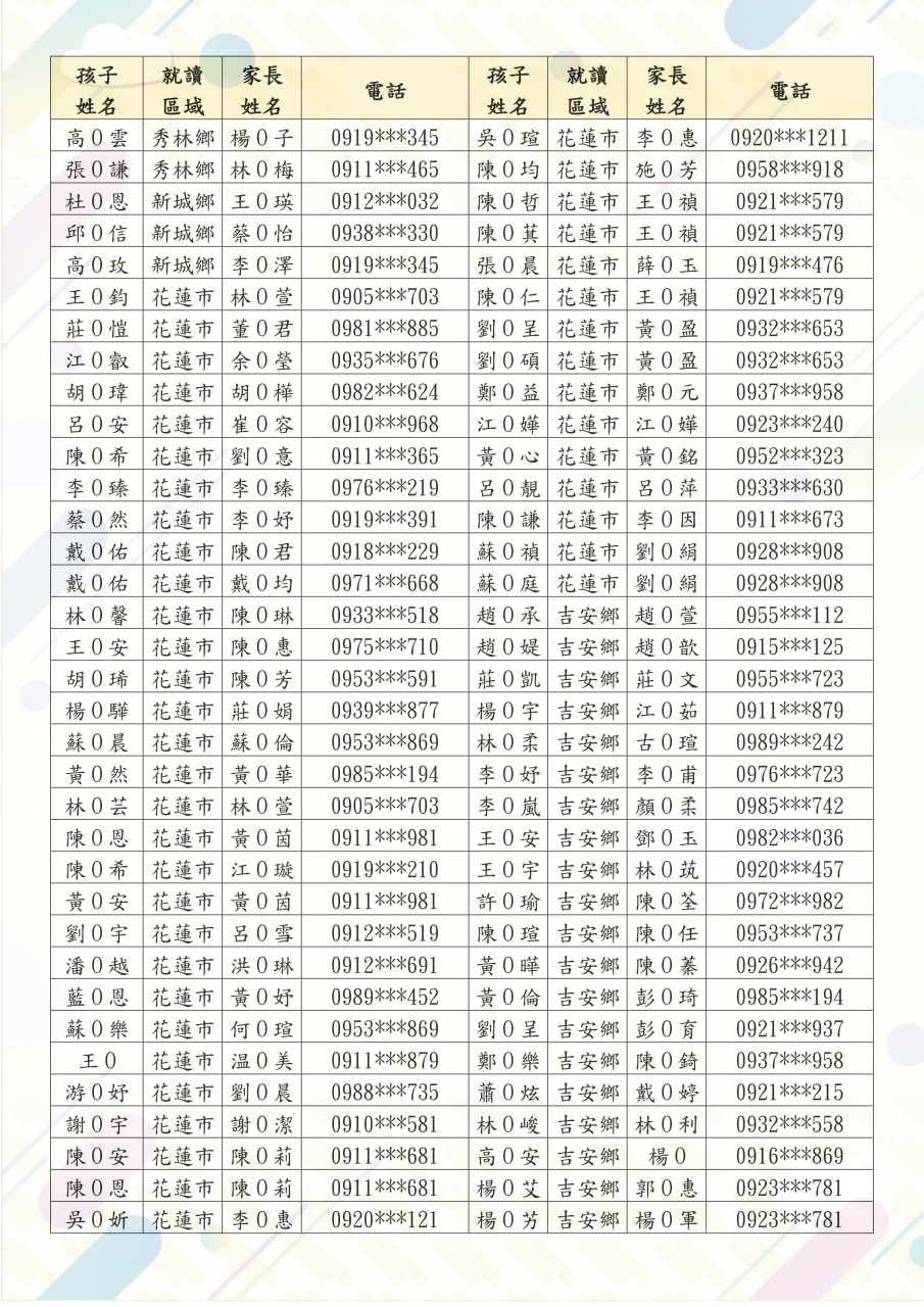 依報名名單上所列的「就讀區域」進行報到(如:花蓮市、吉安鄉、壽豐鄉...等),節省您寶貴的時間唷